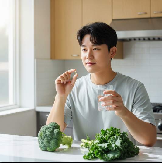 A1. 브로콜리를 살짝 쪄서 잘 씹어 먹으면 설포라판을 섭취할 수 있습니다. 하지만 영양제는 수십 킬로그램의 브로콜리 새싹에서 유효 성분만을 농축한 것이므로, 특정 건강 목적(항암, 해독 등)을 위해서는 영양제 형태가 훨씬 효율적입니다.